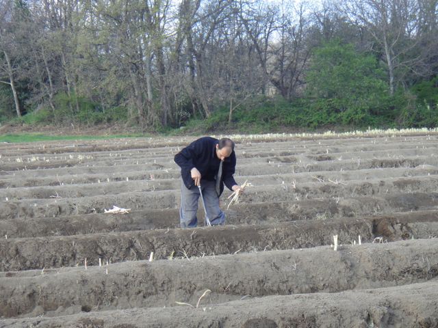 Il y a eu 2 semaines sans pluie, la terre a séché, et on a pu butter les asperges. Dès que la butte est faite, nous la recouvrons d’un plastique noir, ainsi, la terre reste bien souple même s’il pleut. De plus, la couleur noire accumule la chaleur et permet à l’asperge de pousser mieux. Enfin, ce plastique empèche les mauvaises herbes de pousser. Comme ça, pas besoin de désherber!!! Seul inconvénient : comme nous ne voulons pas changer ces plastiques trop souvent, nous devons réparer à l’agrafeuse les trous qui apparaissent…Certains plastiques ont plus de 10 ans.